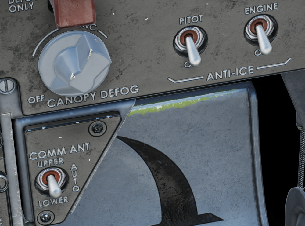 I generally like the new F-5 cockpit, but there was something that was bothering me about it and today I found out what it is. It seems like the textures are over-sharpened (or whatever else processing with similar effect) - especially around texts. I assume the text has some texture, perhaps it's etched or what, but look at it: The black contour lines around the text are clearly visible. And close up: This is even worse, it looks more like a cartoonish game. Many elements don't seem to suffer from this effect. E.g. the knobs seem to be OK, pedals are also fine, but the text is funny with the outlines. What do you think?