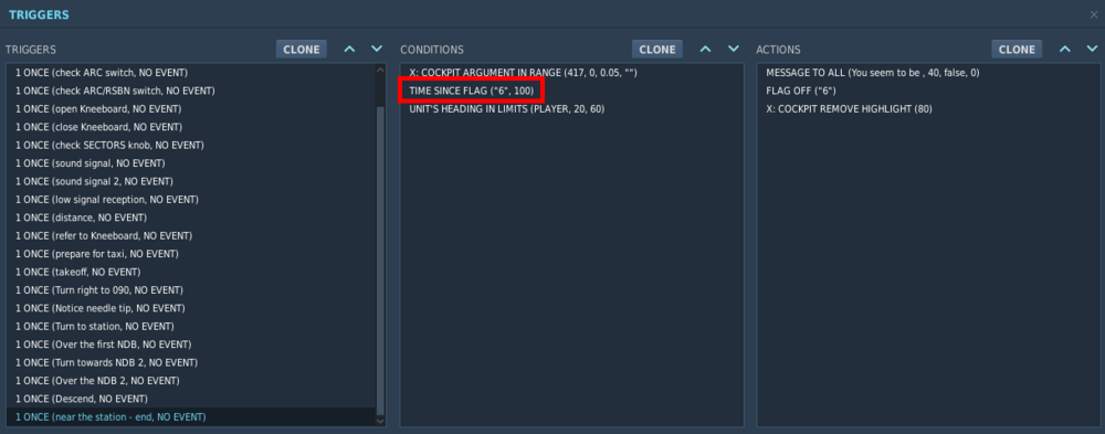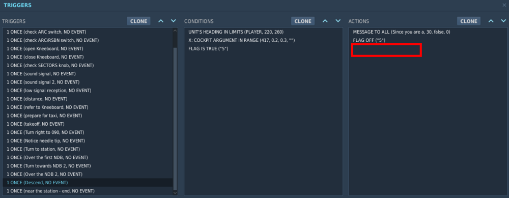 I've flown the ARC mission, I landed, even tried to go to the starting spot to get some conclusion - nothing. So I opened the mission file and I believe there is missing FLAG ON for flag 6 here: I checked some previous triggers (e.g. Turn towards... 4th from the end) and it has both OFF for 4 and ON for 5. The last trigger waits for the missing flag 6: Hopefully, I'd have the cockpit args in range, heading was definitely OK.