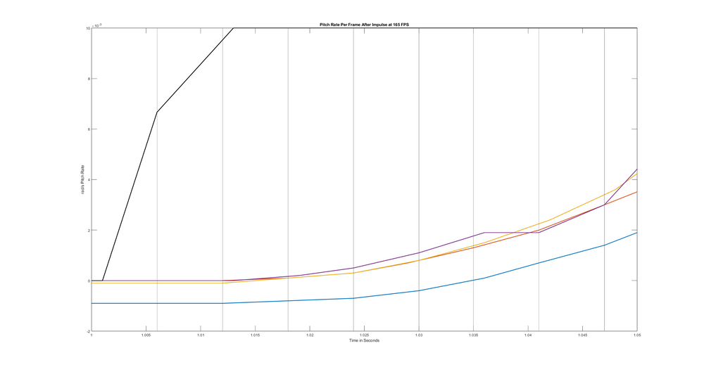 Control response (in pitch) has been remeasured due to reported changes on Reddit by @BIGNEWY, this time at 165hz! It appears the response latency in control for the F-16c has been reduced dramatically to a point of imperceptibility in the last update. Changes to pitch rate are seen 2 frames after input at 165 FPS: Also just to avoid not being smart, I recorded a response at 60fps to make sure it was more time based instead of frame based and confirmed the pitch rate responds on the very next frame. The black line is the controller input forced by the command LoSetCommand(2001, 0) and LoSetCommand(2001, 1) while recording pitch rates simultaneously from the export.lua using LoGetAngularVelocity() Also, I can only record pitch or pitch rates AFAIK, not the position of the elevator itself. It is possible the elevator is being moved even sooner before the dynamic model reacts to it.