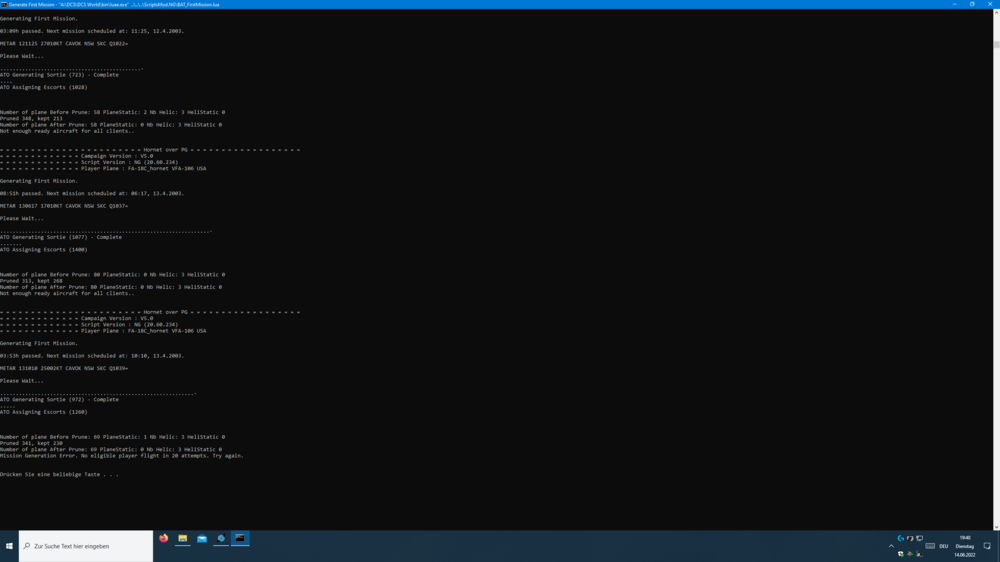 Hi, I'm having issues with "Hornet over PG" campaign. I think it's since last update (2.7.14.24228) - "Falcon over PG" works fine. The mission generator cannot create missions, or it takes several attempts and then I only get CAP missions. Even the ScriptsMod_234 could not solve my problem. Tried even a new save of "Hornet over PG_first.miz" and"Hornet over PG_ongoing.miz"...no help. Is that ment by "re-register" ? As to be seen on the screenshot...