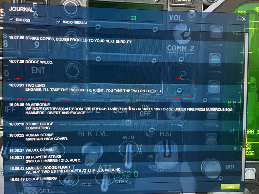 I see under the latest open beta update DCS 2.9.2.49629 you committed the fix for this issue: DCS: F/A-18C Rise of the Persian Lion II Campaign by Badger633 Mission 1: Correct boat name / fix vehicle tracks airport. Mission 3: Bog hammer attack fixed. Safety added to Bog hammers. However I think there is now another bug with DCS 2.9.2.49629 and Mission 3. The bug is as follows: Let me know if I should start a new thread or stick to this one. * Between Dodge wrapping up their ship check and the distress call, a call is made to engage enemy bandits. I would expect this calll (event) much later after strike has notified me of possible air assets. * The result is we engage the bandits but my Wingman never does. I kill off the right most bandits and the left most bandits remain. I think the event ordering may be causing this. I have attached a screenshot of the communications that show the out of order events: -