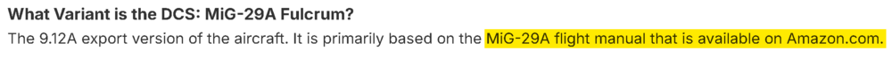 I'm still waiting for an answer as to what particular manual that is referenced in the FAQ as available on Amazon, is used in development of this aircraft for DCS. At this point it's obvious my question is just being blatantly ignored. Why is this such a hard thing for you guys at ED to answer? Seriously, all I want is to order a copy so I can read up on the material that's directly involved with the development of one of my favorite aircraft and to add it to my collection. For what reason are you keeping that a secret?