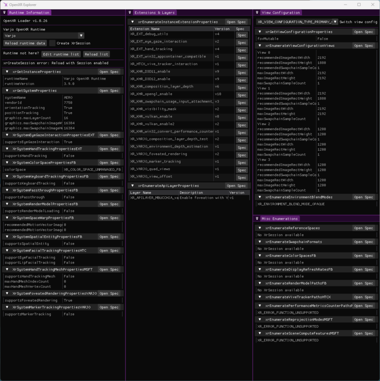 The reason I opened WMR is to check the API 1. Uninstall WMR stuff, Uninstall OpenXR Toolkit (for now), Uninstall OpenXR InstancedExtension wrapper (if you installed it, also switch VarjoOpenXR.json file back to the original one). (I will unistall WMR, I did unistall OpenXR InstancedExtension wrapper today early in the morning and I disabled OpenXR toolkit but I will unistall it now) 2. Download and install Varjo_Foveated mod, Home · mbucchia/Varjo-Foveated Wiki · GitHub (Done since yesterday, but given the double cursor issue I reverted back to Steam VR OpenXR, but still have it installed) 3. In Varjo Base app, make sure OpenXR switch is ON (this will disable Steam OpenXR and use Varjo OpenXR instead). (Had it on but again had to switch back because of the double cursor issue as to me that's umplayable like that) 4. Run DCS.exe from bin-mt folder, no command line. (Been using bin-mt since update came out) 5. You can use OpenXR Explorer to examine current API, res, extensions, etc. (not the WMR tool one). (I will give this a try to see if it points to the issue I'm having, definately something is not working propertly here and I appreciate everyone's help on the matter. I dont consider myself an expert but I do get around this sort of stuff) -