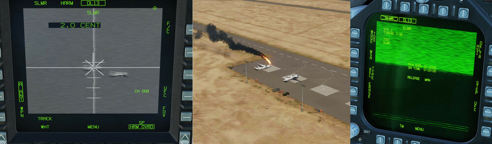 Вчера в онлайне (карта - Сирия) наблюдалось такое изображение с ГСН AGM-84H: на экране видны только юниты, добавленные на карту создателем миссии. Здания, сооружения и другие объекты, находящиеся на карте изначально, видны не были (См. скрин 1. Скрин 2 - то же самое место сразу после попадания). Сейчас проверял в оффлайн миссии - изображение правильное. Скрин 3 - а так уже несколько патчей отображается страница DSPLY SLMR, если связной контейнер включен. На него накладывается зависшее изображение помех, как при работающем DL13 при отсутствии сигнала с ГСН ракеты. Если контейнер не подвешен или не включен, страница отображается, как раньше - на равномерном зелёном фоне. И надпись в центре ON TIME 0:10:00 тоже отображается постоянно.