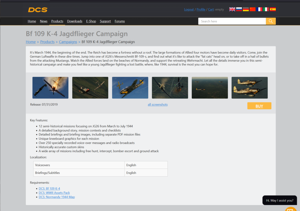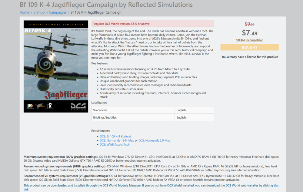 This is doing a google search specifically for your campaign, brings it to the specific campaign that shows the correct information Ill submit this like MAXsenna said. Thanks for the time. To clarify, going through links from the DCS website itself brings up the page taht show the first image, but google searching specifically brings up the second. Ill post URL's here in a sec https://www.digitalcombatsimulator.com/en/products/campaigns/bf_109_k-9_jagdflieger_campaign/ this is the URL that comes up going through the normal channels from the ED website Here is the URL doing a Google search for your campaign https://www.digitalcombatsimulator.com/en/shop/campaigns/bf_109_k-9_jagdflieger_campaign/