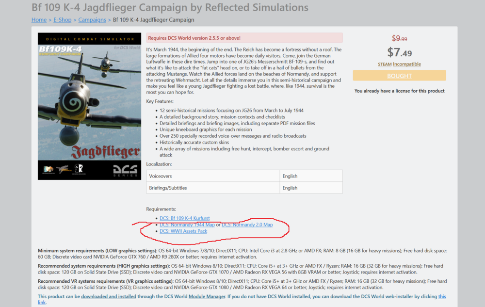 Just wanted to post that Reflected Simulations campaign for the 109 K-4 Jagflier is bit misleading going through the normal channels on Eagle Dynamics website rather than a google search for the campaign itself. Im not sure this is the correct channnel to post but there is a difference between searching for the campaign solely through Eagle Dynamics website and doing a google search for the campaign itself. Going through links on the website is a bit obscure if it works on the Normandy 2.0 map (as painstakingly modified by the creator) or if it requires the older version of the Normandy map itself. Here are some links to going through proper channels on the DCS website as opposed to a Google search for this same Campaign https://www.digitalcombatsimulator.com/en/products/campaigns/bf_109_k-9_jagdflieger_campaign/ Is a direct link clicking through the DCS website as opposed to www.digitalcombatsimulator.com/en/shop/campaigns/bf_109_k-9_jagdflieger_campaign/ from a general Google search for his Campaign The difference is that the information on the /products page and the /shop page do not "reflect" Relected's painstaking changes to the Normandy 1.0 to 2.0 changes and commitment to his campaign to entice purchasers to acknowledged that he has converted the campaign to utilize the changes to include the Normandy and Normandy 2.0 maps. Here are a couple of links to illustrate the problem https://www.digitalcombatsimulator.com/en/products/campaigns/bf_109_k-9_jagdflieger_campaign/ Shows that Reflected's campaign is compatible with the Original Normandy Map BUT While doing a google search for Reflected's campaign is compatible for both the original Normandy map as well as the Normandy 2.0 Map https://www.digitalcombatsimulator.com/en/shop/campaigns/bf_109_k-9_jagdflieger_campaign/ The difference here is a google search rather than going through Eagle Dynamics website Shop>Campaigns>Page 6>Bf 109 K-4 Jagdflieger Campaign by Reflected Simulations...Shows different compatibility information about the map used that a general Google search for the same Campaingn. Here are a couple URL's to illustrate the problem https://www.digitalcombatsimulator.com/en/products/campaigns/bf_109_k-9_jagdflieger_campaign/ vs https://www.digitalcombatsimulator.com/en/shop/campaigns/bf_109_k-9_jagdflieger_campaign/ The difference is one is derived from following links from the ED website and on is from a general Google for Reflected's campaign for the 109. the /products page and the /shop page show different compatibility for his campaign on the Normandy map. Not a huge issue, just noticed while I was trying to purchase his campaigns. Thanks and love you all couldn't find quite the right forum topic to post this in as per user @MAXsenna in this post but thanks to him in either case. Take care and much love.