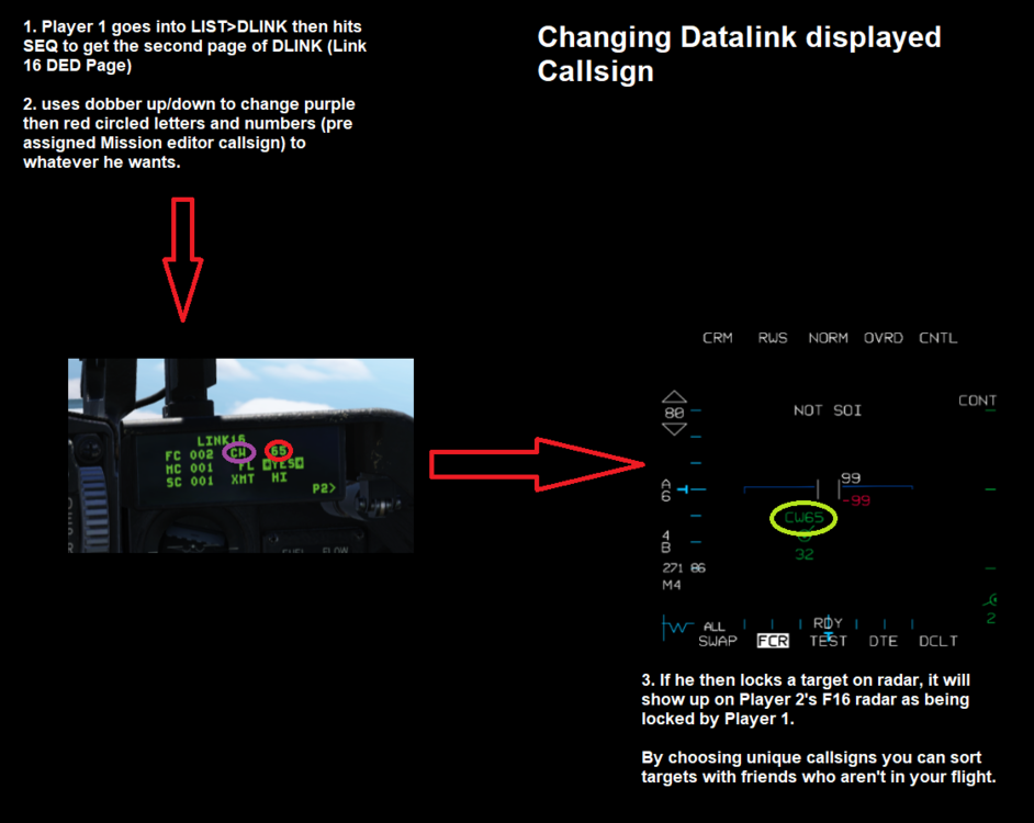 Not quite the blue dot solution the OP was after, but we experimented with the ICP's Datalink functions about a month ago and found that you can change your four-character callsign (where your Editor assigned callsign 'Enfield 1-1' shows as 'ED11') to whatever you like. This will then reflect on other F16s' radar pages if you lock up a target they can see. It will also show up on the Hornet SA and HMCS. -