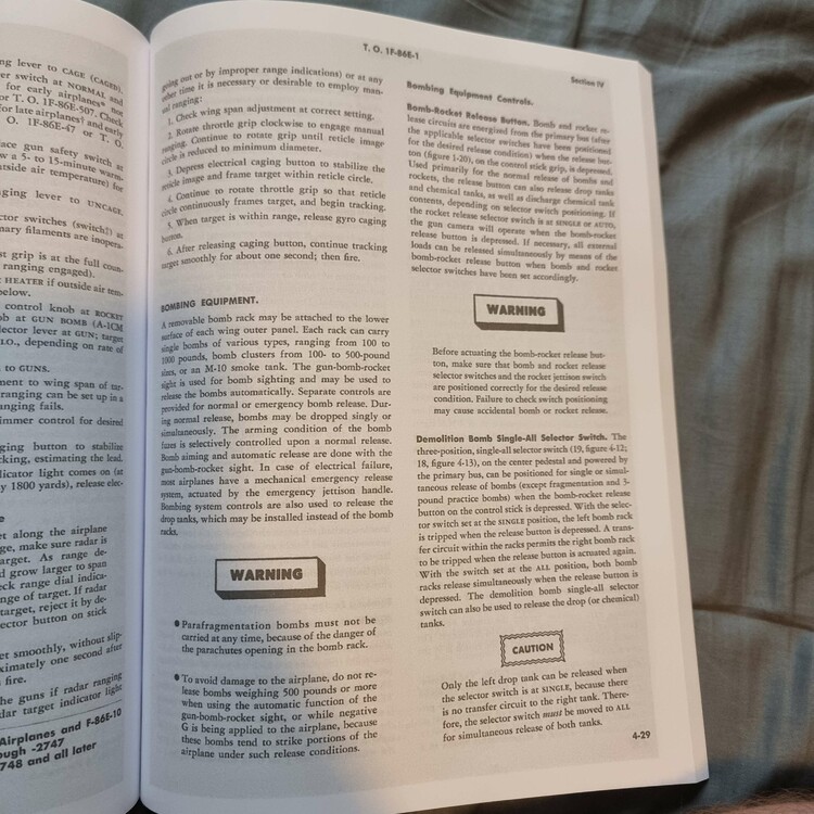 Hi all, just a quick post highlighting some missing ordinance that the Sabre historically was equipped with as per manuals for the F-86-E series and F-86-F35 (the Sabre we have in game). As per the manual for the F-86-F-35 and F-86-E-1 shown above, the Sabre should have access to the M65A1 bomb with the T142 fin assembly on pylons 4 and 7, currently in-game the Sabre has access to the M-64A1 general purpose bomb and M177 "Demolition" bomb on these pylons. F-86-F-35 documentation F-86-E-1 documentation Currently in game the only M65A1 that is in game I believe is part of the WW2 assets or is a droppable ordinance from the AI B-52/B-17 You can see what I'm assuming to be the 1000lb bomb above, used in this video by the Grim Reapers showcasing the AI B-17 below https://www.youtube.com/watch?v=PKKNpg2olFM The M-65A1 W/T142 fin can be seen here in this manual of ordinance (OP-1280 Aircraft bombs) Thanks in advance for adding this ordinance option as I was surprised to learn it wasn't already in the sim. References/source bibliography F-86-F manual http://aviationarchives.blogspot.com/2017/07/f-86f-flight-manual.html F-86-E manual (No PDF available at time of report, listing point of purchase) https://www.amazon.com.au/Sabre-Pilots-Flight-Operating-Manual/dp/1430312335 OP-1280 https://bulletpicker.com/pdf/OP 1280, Aircraft Bombs.pdf -