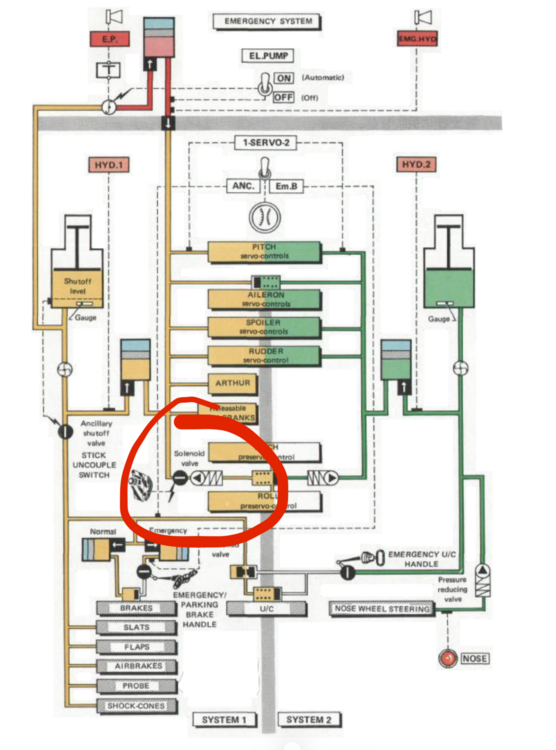 I was just asking myself the same question and consulted the manual which states on page 33: „As mentioned previously, in case of the pressure of circuit one falling beyond a certain threshold, part of the circuit is isolated and an electro-pump is activated.“ This confuses me. Which parts of the system does the automatic system „Ancillary Shutoff Valve“ isolate and which ones does the Stick Uncouple Switch then isolate on top? When I understand that diagram on the same page correctly the Uncouple Switch only isolates the autopilot servos and the Ancillary Shutoff Valve isolates all the ancillary systems