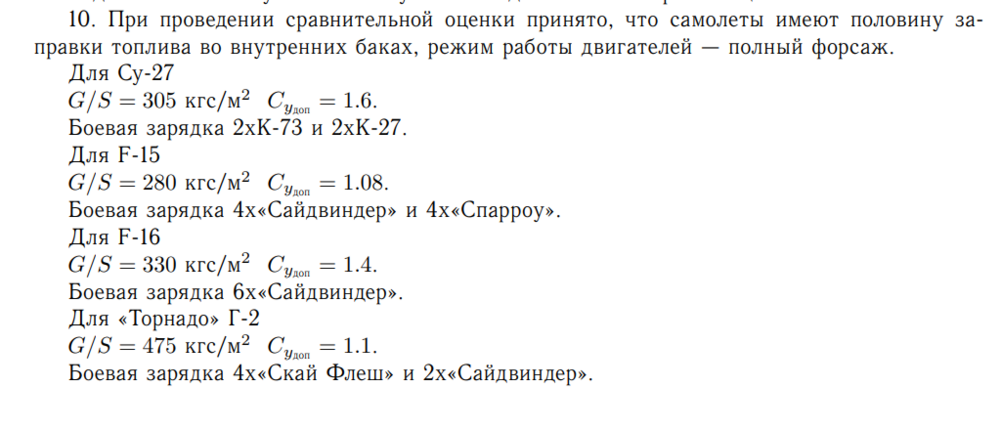 3. I have a few questions about Su-27, and my apologies in that I cannot understand Cyrillic. But in TsAGI Su-27S paper, what does 1.6, 1.08, 1.4 numbers represent for Su-27, F-15, F-16? Also, so once Su-27S and SK are are equal or less than 19,000kg they can both pull 9G? 171000/9=19000kg and as long as it's less than mach .85? Lastly, I get it that in the TsAGI report it lists 18920kg as design flight mass at 50% fuel reserve, but does any one know the exact amount of fuel that is and the Su-27S operating weight? (easier to write it as operating weight?+fuel?= 18920kg) Thank you.