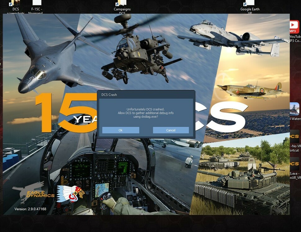 1. Thanks for taking a look at this. While I did find a missing space in my command line between VR and the --switch for force_openxr, editing the space in did not make any difference. It crashed at the same point again, generates an identical logfile pretty much every time. Same faulting module (GraphicsCore.dll), same access violation code, etc. When I launch from within VR using Oculus Quest 2 K launch DCS.exe shortcut from desktop. I see the DCS Login progress bar, then NVIDIA splash, then 15 years of DCS. Then desktop goes away and I'm in white VR grid environment with DCS World Steam Edition Loading... hangs there. I remove Oculus headset to see crash message on monitor screen: This time I elected to gather addl debug info using dxdiag and I sent crash report, though I'm not sure it actually did anything. I might've seen a line saying something was full or not available or something to that effect. Looking at your command line, it appears you have your DCS installed outside of steam, whereas my executable path goes through steam. I'd have to uninstall/reinstall to configure my install that way, am I right? That only feels like a workaround, but it may be worth it if this issue takes a while to get sorted. Since other apps not using Steam VR work fine, I may consider this.