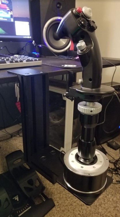 Yup the extension is 3 pieces, different sizes, of nice aluminum tubing threaded on each end, and 2 collars with set-screws so you can adjust the length a bit on the tube of your choice. Positioning the grip is actually easy to change on the fly on the Warthog, I just unscrew the big metal thingy a bit, turn it, tighten. So when I do move to sidestick, I actually angle it the same amount the opposite direction. This is the first time in 2 decades of flight simming that I've been able to get the freakin grip where I want it, and the perfect angle. So... say I want to fly Viper and go sidestick, let's time me: Quick-lever unclamp the stick mount, slide it over, clamp the lever back. 5 seconds if I'm being attentive. Unscrew Warthog stick hand-collar, turn stick, tighten. 3.142 seconds. 8.142 seconds total to reconfigure my cockpit. -