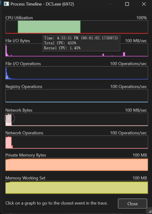 When I enter the main game interface, select the Multiplayer tab, and let it refresh itself, DCS freezes the entire system several times. It seems that it always freezes for tens of seconds when a new server is refreshed and the UI is updated. When all servers are refreshed and the refresh arrow on the top stops spinning, it will freeze for several minutes. When it freezes, I can't move the mouse, can't switch windows, and the monitor screen is frozen. I first encountered this problem a few days ago and tried reinstalling DCS, reinstalling the graphics driver, doing a windows update, and reinstalling the motherboard and CPU firmware, but none of them improved it. I used Process Monitor to observe and analyze and saw the CPU usage during the frozen time is 435%