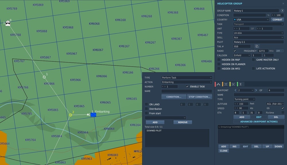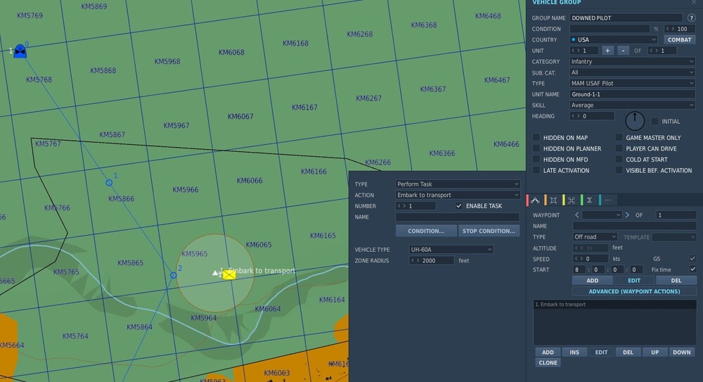 Hello, I'm trying to make a simple mission where a downed pilot is picked up by a helicopter. I've watched a few videos and feel like I am doing everything correctly, but the helicopter just flies by without picking up the downed aviator. Attached are some screenshots of the advanced waypoint actions for both the helicopter and the downed pilot. The embark point is well within the embark zone I created for the heli. Any help would be appreciated here - this seems like it should be fairly straightforward. EMBARK TEST.miz NO EMBARK.trk
