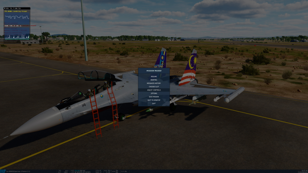 FIRST: Sorry about the inconvenience as editing this post is only resulting in breaking it more and more and thanks to ED for making the worst forum interface i ever seen in 30 years of web surfing Ran a couple experiments.. loaded several jets in that mission as was getting fair amount FPS (from high 70s to 110) %5Bimg%5Dhttps%3A//i.imgur.com/NS7k2ec.jpeg%5B/img%5D Then loaded latest SU-30 version and drops to single digit figures ..both in cockpit and outside then i found something interesting.. My plan (wich i did after) was to replace the previous version (2.7.98b) to compare framerate So right after taking the screenshots of low FPS in the current 2.8.02b ver ..i pushed ESC to get to the menu and as soon as i press ESC and get the game menu frame rate raises to 100-110 instantly.. null You can still move the camera arround so the game is rendering the 3D model..but as soon as you go back to game framerate drops to single digit .. press ESC and raises to 110 again BTW.. the previous version of the SU-30 (2.7.98b) runs ar arround 50-70fps: