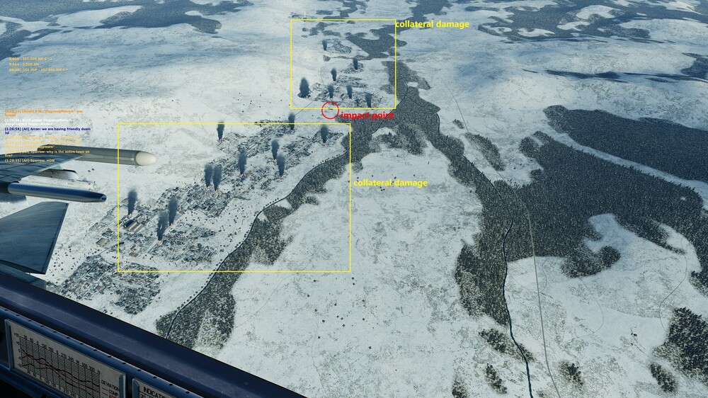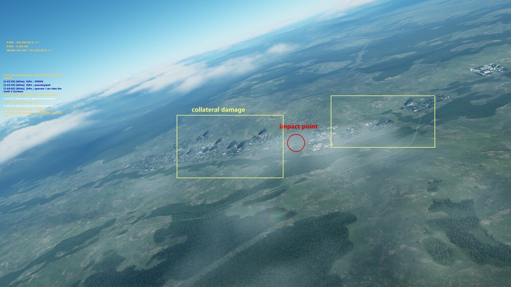 I was about to post something about it.. I frequently play in 4YA servers where there is a secondary mission to destroy 4 bunkers .. they require anti bunker weapons, be it the BetAB500 penetrators or the GBU-24/31 But for the last days when i drop one in CCIP mode from a FC jet from about 600m alt (followed by hard pull up) not only i get splash damage ..but the entire town arround it in like 2 miles arround gets set on fire in the screenshots taken 2 different seasons you can see the effect of just a pair of BetAB500 concrete penetratos.. even when they dont kill the bunker they destroy the entire town miles away