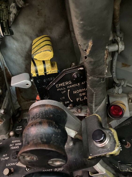Just a heads up, the flaps position switch is a 3-pos switch with it being up-half-down. The red light surrounded by yellow and black caution walls is the ejection light, it’s a button that the pilot presses to alert the WSO that they’re going to eject. -