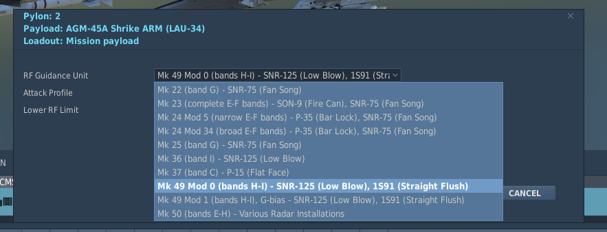 10. edit: Tbh I think Shrike guidance just might be deeply and utterly bugged. No clue whats going on sometimes. -------------- Idk if that chart is correct. The Shrikes seekersays MK 49 is required for the SA-6 "straight flush" search radar: Im getting tone and (buggy) guidance on the SA-6 search radar. Frankly tho, my tests and others indicate that Shrike guidance is just deeply and utterly bugged. Sometimes they give tone and guide, but only sometimes, lofting Shrikes dont activate at all for me, search radars sometimes only get tracked during active engagement (and not during search). Sometimes they track only long range, or only short range. Idk if there is some hidden complexity to explain any of that.