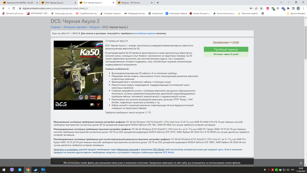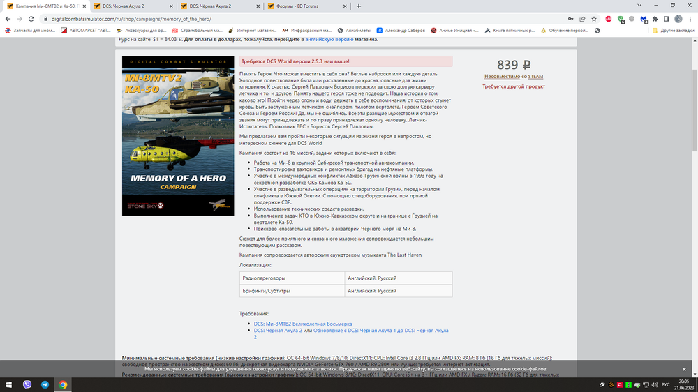 Еще раз извиняюсь за то что не по теме, но продолжая разговор о кампании "Память героя" вот что у меня на данный момент. Скачать или купить отдельно модуль Ка-50-2 я не смог. Только пробный период. но даже с ним установленным, сайт наглухо отказывается мне продавать кампанию. Кнопки "купить" или "добавить в корзину" у Ка-50-2 не было - устаревшая версия и до свидания. Шах и мат короче. Помогите если можете)) -