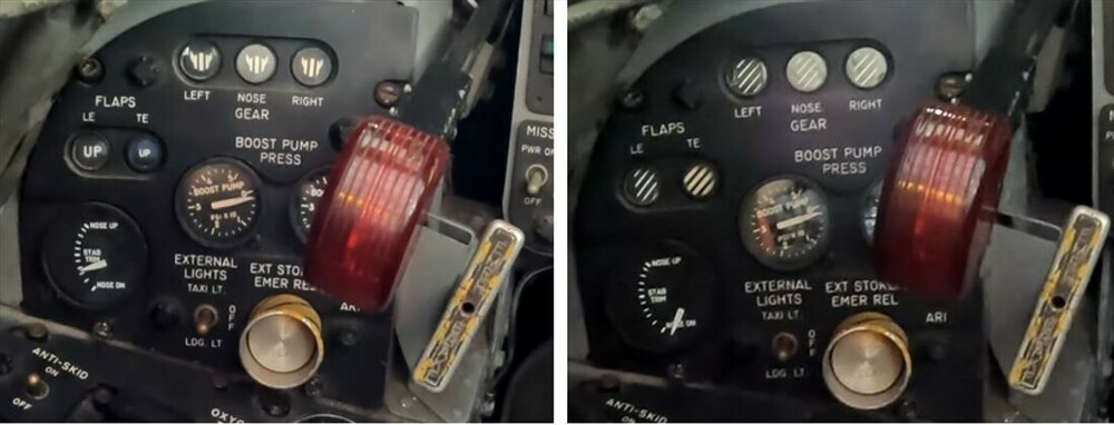 Undercarriage Indicators --> no UNKNOWN POS. readback with collapsed or partially coll. Landing Gear also no Hydr. Pressure Loss in both Sys. when Landing Gear ripped of ? Instrument Lighting Front Cockpit/Front-left Sub Panel (Flaps/Slats/Gears(Undercarr.)) --> seems to stay OFF (i´m not shure if these are internally illuminated (no schematics) ... but think they should -> pic .... (even with all Instr. Lights ON/Bright > nothing) [with 5 pins an internal lighting schould be implemented]