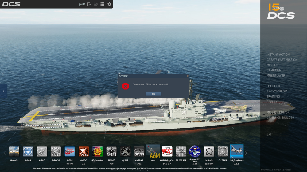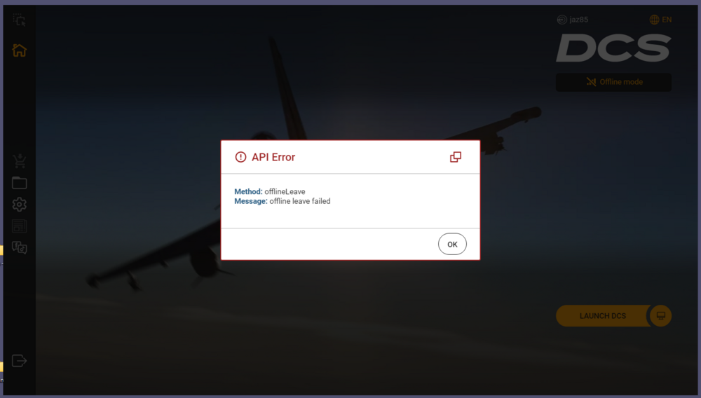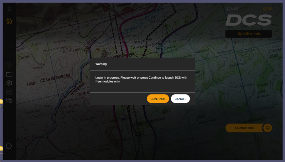 Complete error: Warning Login in progress. Please wait or press Continue to launch DCS with free modules only. Since the March 19, 2025 update, I get the above message when launching DCS when in offline mode AND when third party modules are in installed in my Saved Games/DCS... folder. The interesting thing is that pressing the CONTINUE button brings me into DCS and I seem to able to use free and paid modules as usual. Another bit to this is that I am unable to exit offline mode via the launcher, rather I simply have to exit out of DCS and then remove the offline.bin file from my Saved Games/DCS... folder. Anyway, I do not think this is a critical issue, but would be nice to have it fixed.