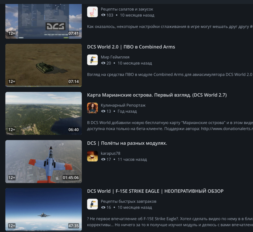 Уважаемые друзья, может вы и знакомы с тем, что публикуют на Рутубе, но я недавно просто запустил поиск по DCS там и немного прифигел. Там немало видео по DCS, но оно своровано всякими левыми каналами. Причем некоторые видео я даже узнал, но они явно делались не "Маня делает рулетики"