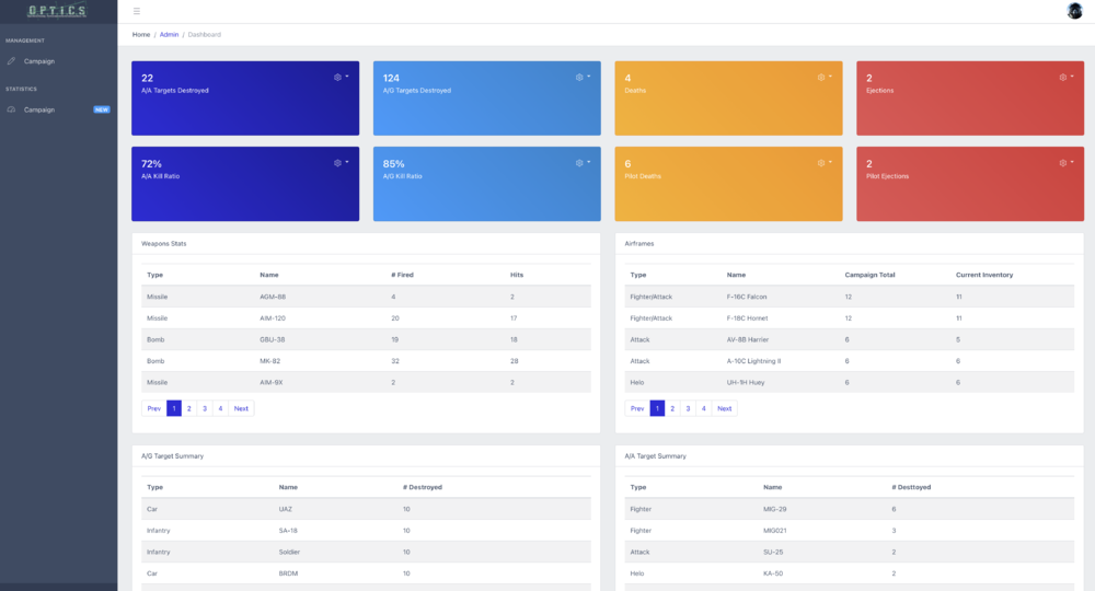I am working towards this as an ultimate goal. To visually represent the current mission but also track missions over time attributed to a campaign. The idea is that once someone has uploaded the XML file from Tabview up to the server, it gets processed into the DB and then these dashboards update with the appropriate stats. With the right queries, the dashboard can also serve as a kind of battle damage assessment tool. Using events from TacView to determine which targets were hit to guide decisions for the next mission they are planning. Will also give players stats on their kill ratio for the mission (or campaign). Give stats on weapon effectiveness....etc. I have been slowly putting this together in Django. Still quite a few significant challenges to overcome but uploading the XML file and processing it into its SQL table components is not one of them. That is done. It's the meaningful queries that give these stats that is the challenge. -