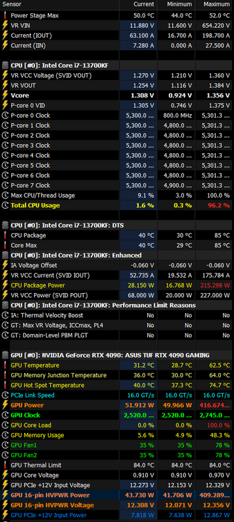 in the interim i have been able trigger the black screen consistently, not with DCS, but with praydogs UEVR mod + Robocop: Rogue City. This hammers the CPU and GPU in a manner that seems to trigger the behaviour within 2min of gameplay (where stress testing with tools such as 3DMark do not) I collected data in HWINFO every 500miliseconds...others have suggested that NVidia firmware might respond with minimal voltage tolerance to mitigate the burn-the-house-down risk with the stupid 12VHPWR connector - the voltages near the event seem normal (16pin HVPWR voltage at 12.157 which is similar to other loads that did not result in black screen + fans 100% requiring hard reset). Other relevant sensor data near the event (all seem within operational boundaries - note i had a 97% GPU power limit set, locked all cores to 5.3, vid request limit to 1.4) GPU Power: 415.173W; 16pin HVPWR Power: 406.472W; Clock: 2700; Load: 96%; Hotspot: 70deg C GPU Core Voltage: 1.04v; PCIe Input Voltage: 12.171; 16-pin HVPWR voltage: 12.157 Performance limited ONLY by Voltage Reliability (this is normal and expected at this power level) CPU VID: 1.323v; Vcore: 1.344v; VR VROUT (SVID OUT): 1.351v; VR VCC Current: 82amps; CPU Package temp: 52deg C I found that if i power limited the GPU to 90% (GPU Tweak Utility) i was able to avoid the black screen, well at least for the 30min that i tested in game. Question: I know to avoid the recalled cablemod 16pin adapters; however the CableMod M-Series Pro ModMesh Sleeved 12VHPWR StealthSense Direct Cable Kit for MSI PCIE5 (16-pin to 16-pin) looked like something to try? Any thoughts? Thanks again for everyone's help on this; really do appreciate the advice.