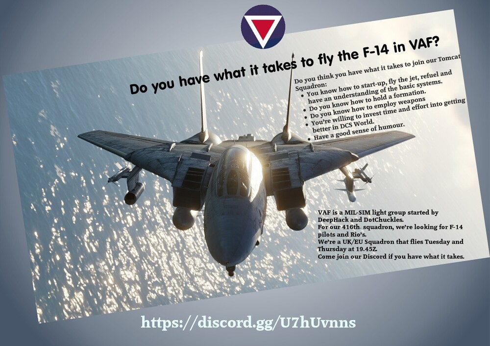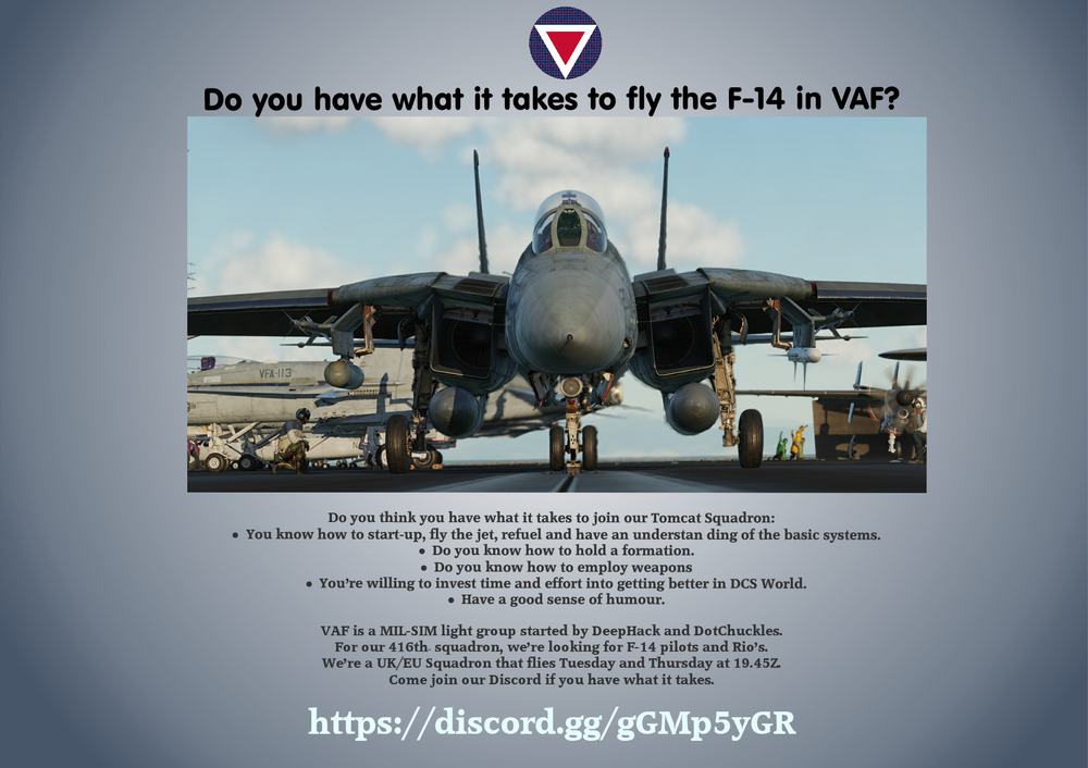 Virtual Air Force is looking for (experienced) Pilots and Rio's for our Squadrons. At the moment our main focus is on the F-14. We are a group of enthousiastic people who have a passion for (military) aviation. Twice a week all our squadrons train (tuesday and thursday) at 19.45 Z. Currently we have squadrons for the F-14, F/A-18C, F-16C and AV-8B Harrier II. If you want to advance in DCS and want to learn your airframe in depth come and join us today. Any pilot that has succesfully completed the check rides is invited to come and join us in missions on our own and other servers. We hope to see you soon on our Discord. https://discord.gg/U7hUvnns