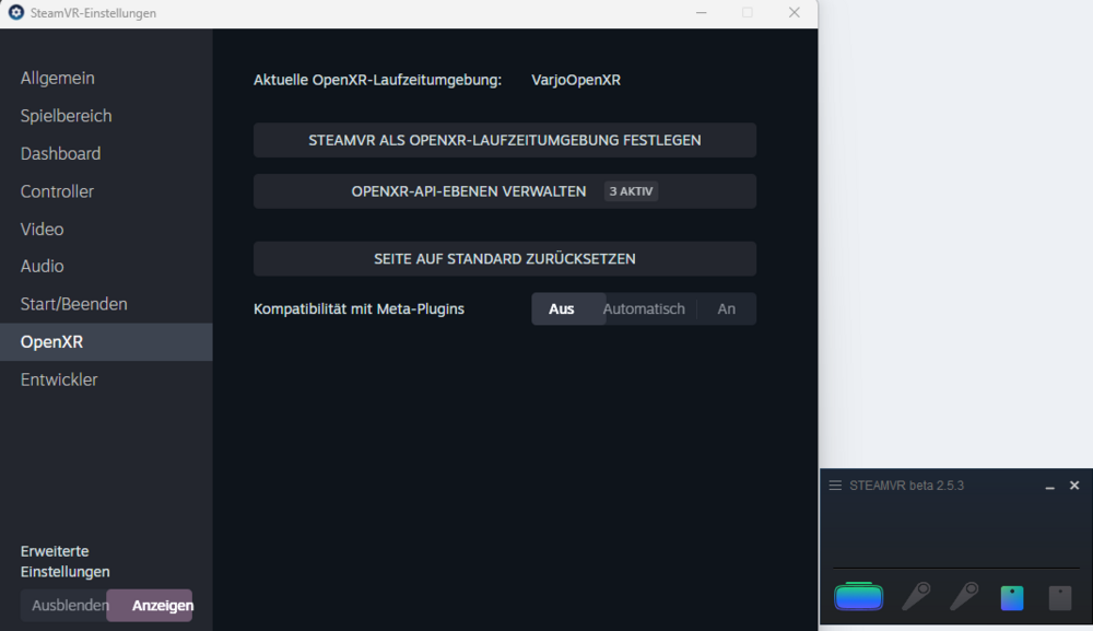 After i figured out that this issue is impossible to solve (for me) i contacted ED-Support Team which tried to help me kindly! Their advice to bypass steam completely and install the nonsteam-Version of the game brought a solution and the game now runs flawless in openXR. So if anyone else is facing such issues like described above: Try the non-Steam Version and move your licenses over from steam and leave your worries behind Thanks ED for support! I leave my Steamversion installed for now - maybe someone has another idea what could have caused the problem and i will then try to see if it get fixed - this could also help others with the same problem.