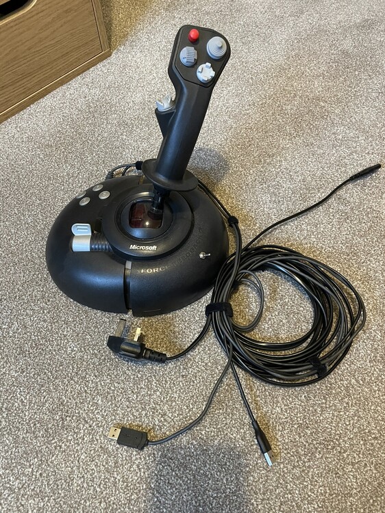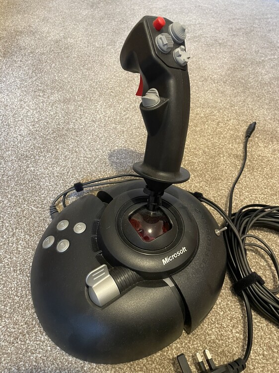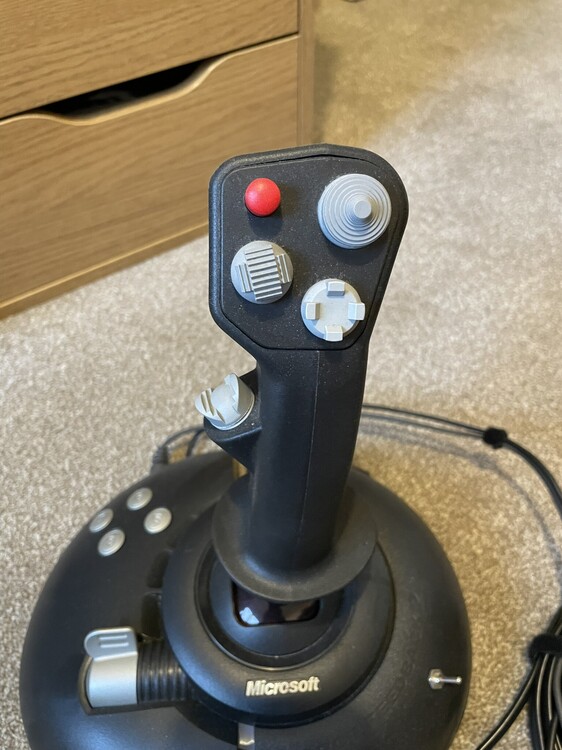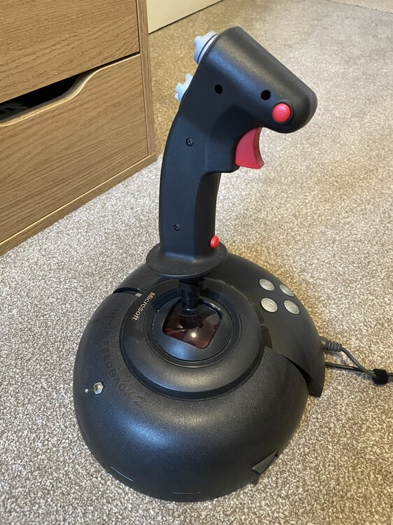 Hey all, I no longer have time for flight sims (sadly) and am looking to sell off my stuff. One item that will probably prove tricky to sell is my stick - it's a custom made (by me) FFB desktop stick. Sidewinder 2 base, CH Fighterstick grip. See images! It's got quite a heavy base due to the motors etc. Basically I took the grip apart, replaced the internals with a Teensy board, and then routed the USB cable out through the base. I also added an on/off switch for the force feedback that bypasses the sensors in the old stick, meaning that you can go hands off if need be, or turn off the motors to prevent the stick shaking around on your desk! The grip is held on with a screw and friction, and it doesn't have any yaw-axis anymore. In-game you have to bind x/y to the sidewinder, then bind the buttons on the grip separately (it shows up as 2 controllers). Happy to provide the source code for the Teensy board although it's basically a simple button matrix and there's nothing to really 'go wrong' with it. I used it loads when I was still flying, it's amazing for rotary stuff! This is an affordable way to get a force feedback stick but with plenty of buttons - the sidewinders only have about 4 so for anything more modern than the warbirds you quickly run out of buttons. This let me bind everything for the Huey, all the important stuff for the UH-60, and plenty for the Apache. Honestly, it was a lot of fun, but I just don't have the time. Would anyone be interested in this at £150, shipped in the UK? My wife would be pleased if it went rather than taking up space!