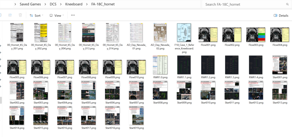 I've added some png file screenshots on cockpit tasks flow (Requiem's), startup (Chuck's Guide), general info (Dimo K) to the Kneeboard for my F-18C, but I can't get them in the correct order sequence. I've tried numbering them and in the Kneeboard folder on my PC in Saved Games they're in the correct order, but in Game when I callup the Kneeboard from the cockpit the order is scrambled. For example, Start1.png is flowed by Start12.png. The other also seem to be reversed in order. Any suggestions?