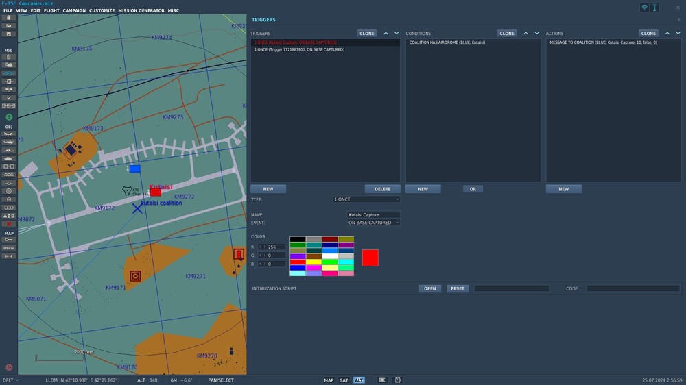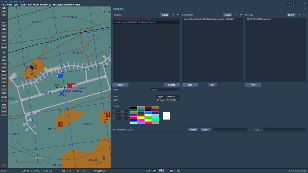 Hey, I've been trying to set up a base capture mission. I've watched some videos showing how to get the base to change coalition once all the enemy units at the base have been destroyed but it's not working for some reason. Can anyone tell me what I'm doing wrong? I only have two units set up for now, one enemy and one friendly (set to late activation). Two triggers, one for the base capture and the other to activate the friendly ground unit.