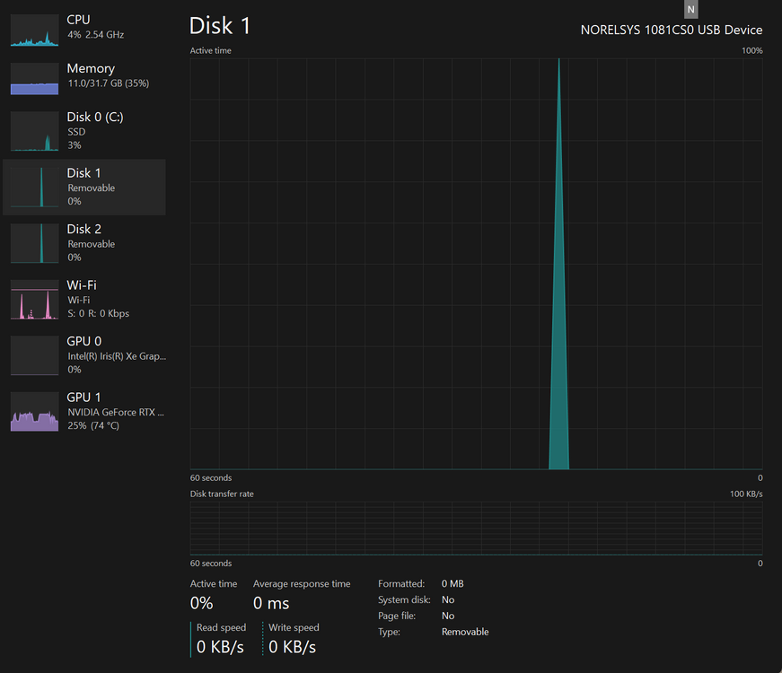 Ok, I got further, I notice that when I get cpu bound, these two removable usb drives spike; I have no external usb drive though, I'm not sure what these are infact...null they're listed as "norelsys 1081cs0 USB device". and are showing up as drives E: and F: