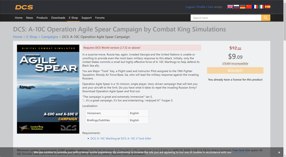 I don't understand how I can reinstall a campaign? Specifically: Operation Agile Spear. It says I have bought it online, I have a key for it, yet I have no idea how to actually download it. In DCS, I don't see it listed in the module manager under the list of Available DLC nor ones in the list of Installed. Running the dcs updater simply says my dcs world version is update to date. What do? Ty! null
