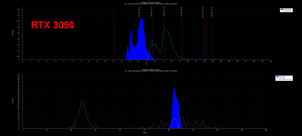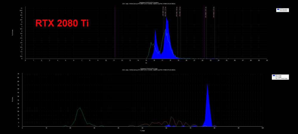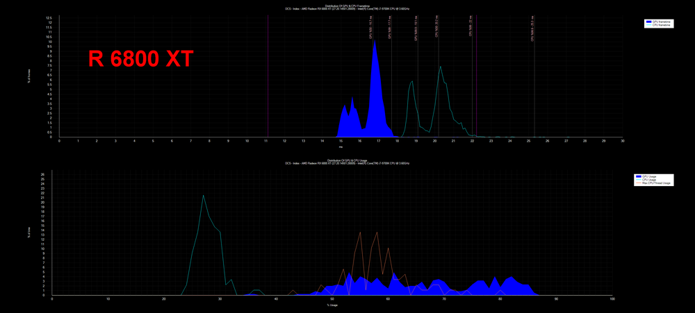 I benchmarked Nvidia RTX 2080Ti, RTX 3090 and Radeon 6800 XT using the same settings in DCS. While RTX 3090 is of course clearly the fastest of the bunch, I found a weird thing considering the CPU frametime values recorded using fpsVR. It appears as if both Nvidia cards have similar CPU frametime and performance despite the large difference in GPU performance. This is expected. The Radeon 6800 XT, however, shows much higher CPU frametime values. The difference is enough to be of practical importance. Actually, sometimes it seems that the 6800 XT is resulting in lower fps rates than my old 2080Ti due to higher CPU load. I very much prefer lower CPU load, because that is usually what is limiting my frame rate in VR (graphics load is tunable by various settings). I'm not sure if something went wrong when reinstalling SteamVR etc due to the entirely different set of graphics drivers. I attach an example of fpsVR graphs. In this specific case: -all possible settings the same for Nvidia and Radeon -mission is the F-18 instant action "ready on the ramp" in PG -30s fpsVR recording sim stopped, then 60s more fpsVR recording with sim running (plane just idling on platform) --> 2 peaks in graphs corresponding to pause on and pause off -steamVR set at 202% with Valve Index (2864x3184) -CPU is i7 9700K @4.9GHz, Z390 chipset, 32GB RAM @3200MHz -Nvidia CPU frametime is around 15.5-16.5ms paused, 17-18ms unpaused -Radeon CPU frametime is around 18.5-19.5ms paused, 20-21ms unpaused, around 15% worse than Nvidia! Can anyone else verify that Radeon drivers eat this much more CPU than Nvidia drivers in DCS and VR ? Or did I mess up something when switching drivers?