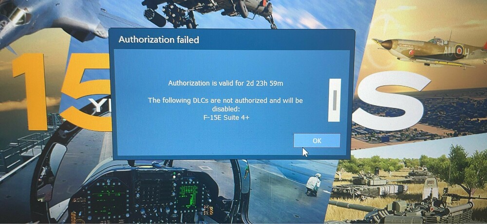 After the update I found that I cannot select F-15E to fly both on multiplayer and singleplayer missions.When i tried to reboot the game,the error of Authorization is valid for 2d 23h 59m