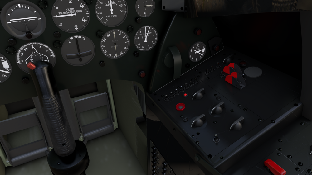More WIP cockpit images. The gunsight has miss aligned UVs in one of the images so uploaded another showing the gunsight with correct texture setup. Next step will be to add more detail and text to the controls and add a few more of the side panel gauges. As well as setting up the interactive cockpit. I'm also working on adding the preliminary EFM for more realism.
