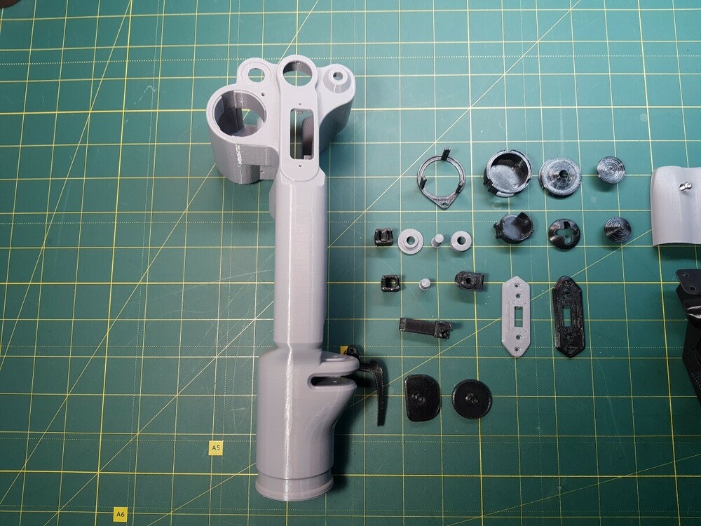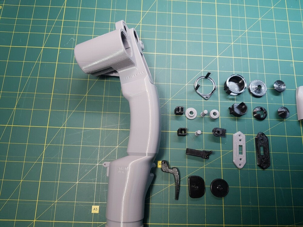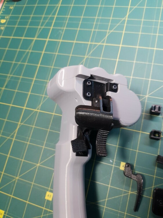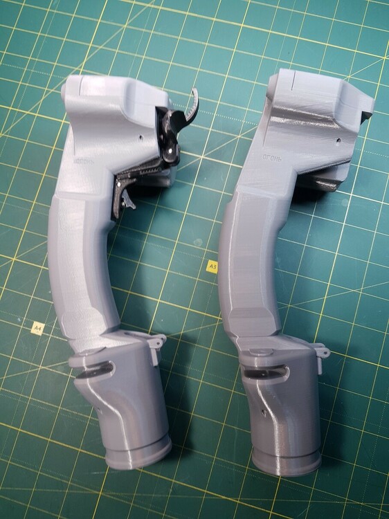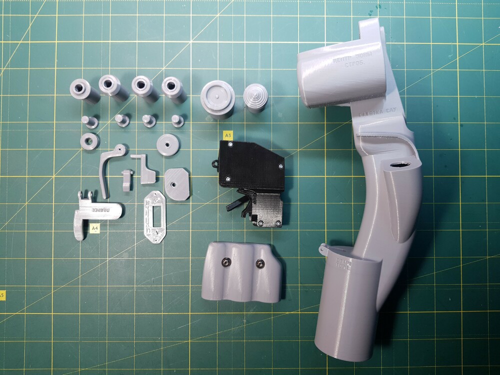Была моделька РУСа Су-27, но увы там было много оплошностей... Была сделана 1 тестовая модель ручки Су-27, в итоге тонкие стенки, во вторых она с 2 половинок и в третьих 4 болта под крепеж. Было принято решение, взять за основу эту модель и изучить размеры, и нарисовать заново геометрию ручки. Была сделана тестовая цельная ручка, серого цвета, без внутреннего крепежа. На 3 ручки, зеленого цвета, уже были добавлены наработки, утолщение стенки и улучшение крепежа. Скорее всего на 4 модели, будут следующий доработки, крышка будет под болты М4 как и на оригинальном РУСе. Также под крепеж механизма курков, будут сделаны отверстия и утолщения.