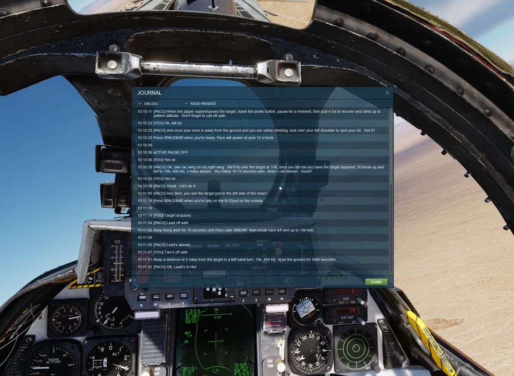 So, i get to "Students Gap", i'm told to perform fence in check. Chig asks me about "mils", i assume it's the elevation lead small knob, but i have no info of how to set it. Nothing in the pdf or kneeboard. It seems nothing really happens even if i intercept Paco. No comms are made. If i try and shoot down Paco, he goes down in flames, contrary to what is clearly stated on the PDF: "- Don’t be afraid to actually fire a missile – don’t worry, Paco is set to immortal." Disappointing...