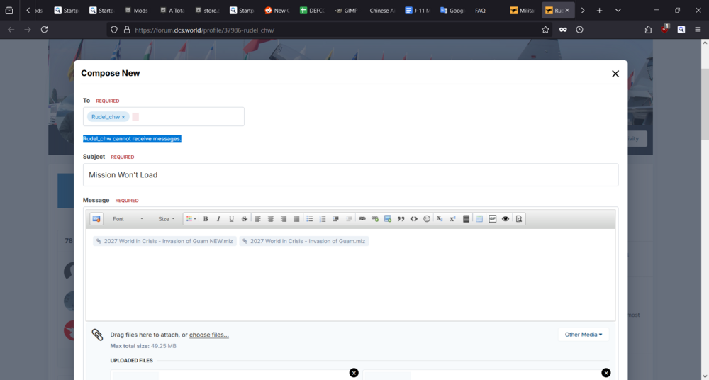 I tried sending you a normal PM with no attachments and the issue persists. It seems that you are somehow unable to receive messages altogether. -