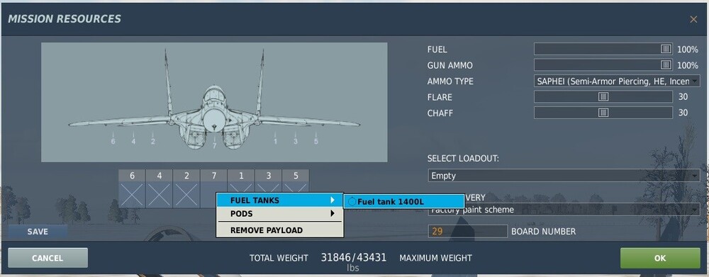 Forget previous pic, DCS had loaded the wrong 29 (FC). I've selected the empty loadout, then added the tank...
