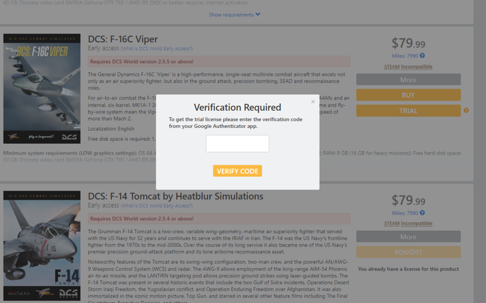Hey, I was trying to trial the F-16 again (I had trialed it in the past) and It won't let me. It just keeps flashing this message: I tired using the Google authenticator app in the past, but it still didn't work. Any tips?