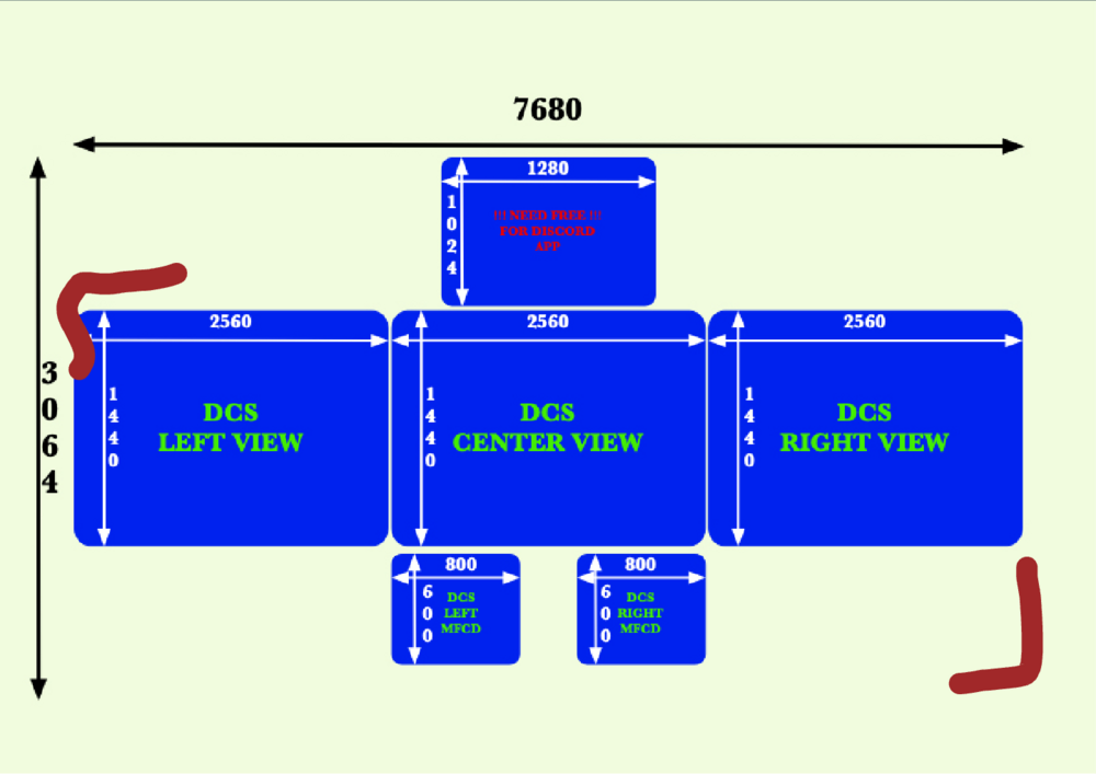 Excellent thanks. I can adjust the file to discount the top monitor. Just didnt figure it was that easy heh. And the DCS resolution will just match the 3 main screens and the 2 MFD ones? Basically, set it up like the top one doesn't exist and DCS should display the main viewport on the 3, and the MFDs on the small ones? EDIT: Nevermind, Y will start at the bottom of the topmost (ignored) monitor