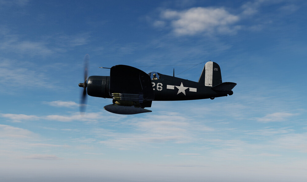 An observation: Level flight 500-1000ft ASL, full mill power (2700 rpm, 54" hg), Oil cooler closed, Intercooler closed, cowl flaps almost completely closed, open just enough to keep cylinder head below red line. 50% fuel for all tests: Slick: 290-295 kts 2x 500lb bombs: 250-260 kts. Drop the bombs, return to 290-295kts 3x 500lb bombs (add center pylon): 250ish kts. Drop the bombs, return to 290-295kts 3x 500lb bombs + 8x HVAR: 210kts. Fire HVARS, 220kts. Drop bombs (slick with empty pylons), 230kts HVARs only: 230kts. Fire all HVARS, 240kts Special case, very interesting result: Load HVARS, take off, fire HVARs (at this point, max level flight 240kts), land plane re-arm "empty" (slick). The pylons are visually still on the plane, exactly the same condition as when you landed. However, now the plane will fly 290-295kts level on the deck again. So after loading HVARs, the pylons apparently cause ~50-60kts of drag. Obviously these numbers may +/- probably up to 10kts because of my ability to trim or variation in cowl flaps or whatever, but I think it's quite a lot of difference if I can reliably see 50-60 kts hit just because HVARs were ever loaded on the plane.