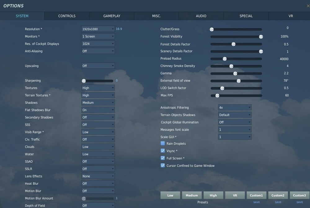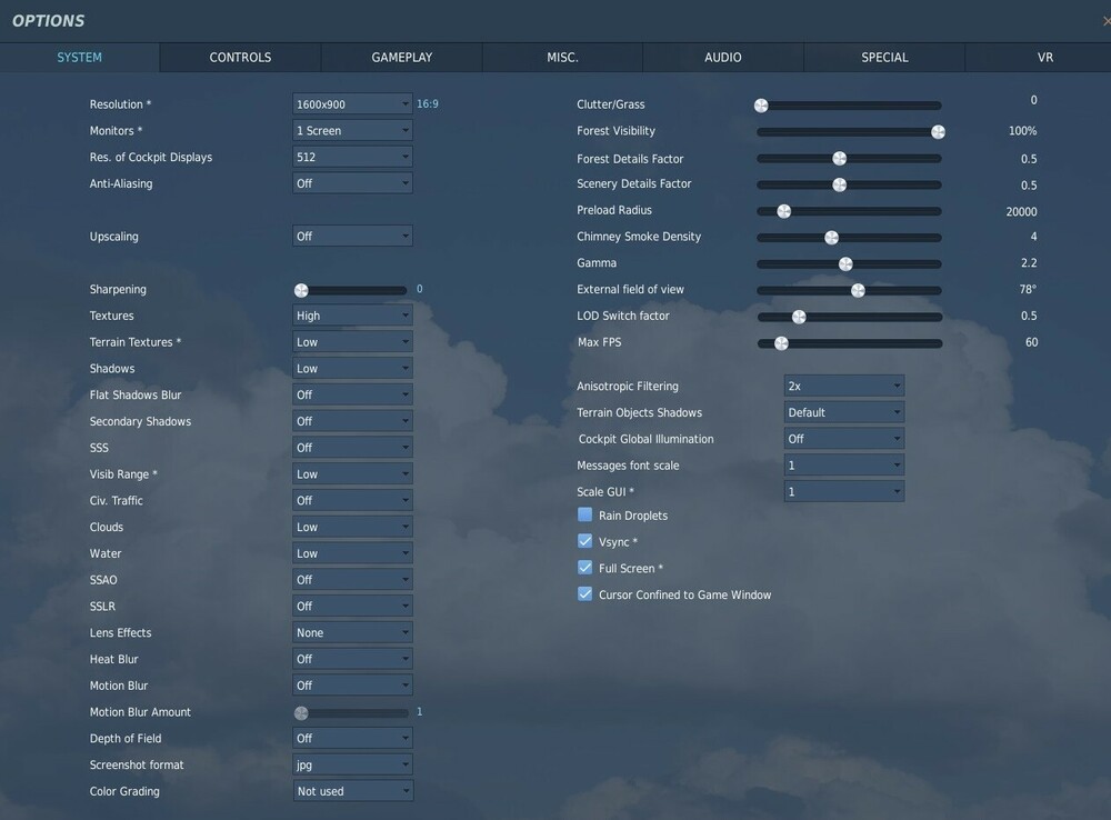 Is he on an old school HDD instead of an SSD, and if so, could that be his issue? My vintage POS box is an FX8350 I've OC'd to 4.6ghz, 32gb of 1600mhz DDR3 pushed close to 1700, no paging file, and a 6gb RTX 2060 which isn't really great, but OS and game installed on SSD... The F-4E module is causing me random crashes and I had to drop my detail settings for it to get acceptable FPS. I get FPS in the 30-60 (my FPS cap) range in simple missions with the F-4E. For example, 2v2 F-4E vs MiG-21 on the Nevada map. My problem with the F-4E module so far is the random crashes rather than FPS although I admit my system is DEFINITELY struggling with it. I can't tell if my crashes are CPU or GPU related, but I REALLY hope that somebody from Heatblur (Maybe I should @IronMike?) will see if they can make another option, at least for a while, to heavily chop away at some of the F-4E's level of detail in systems modeling and help out those of us with sucky systems. Even if it's a single-player only feature, at least for now, it would be great to be able to simplify it's modeling while it's teething and being improved. Obviously, I am due for a new motherboard, RAM, and processor...But...Look it's what I've got...Tax return time...Or maybe my next quarterly bonus check... My usual DCS settings: Where I've turned it all down to get the F-4E flying so far in simple 2v2 type missions:null- 28 replies