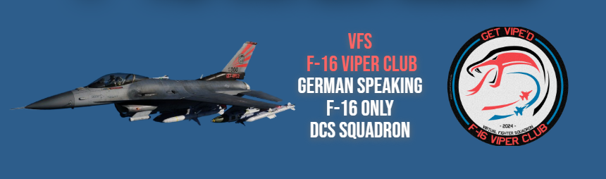 vFS F-16 VIPER CLUB - F-16 ONLY Squadron Der vFS „F-16 Viper Club“ ist ein deutschsprachiges, an Realismus anknüpfendes MilSim-Geschwader für vor allem aktive und begeisterte DCS F-16 Piloten ab 21 Jahren. Unser Fokus liegt auf realistischem Training damit wir für unsere eigenen internen Missionen, oder bei Teilnahme an Community Events mit anderen Geschwadern, bestens vorbereitet sind. Wir trainieren also intensiv unter Anleitung erfahrener F-16 Simpiloten immer wiederkehrende und wichtige Trainingsthemen, jeweils Montags und Donnerstags, ab 19:30 Uhr. Darüber hinaus fliegen wir eigentlich fast täglich zusätzlich Trainings, Trainingsmissionen und "Hot Missions" Für Anfänger und Fortgeschrittene stehen dabei sehr hilfsbereite Mentoren zur Verfügung, die dir bei deinem Start mit der F-16 oder der weiteren Entwicklung behilflich sein können. Ohne Eigeninitiative und den Willen etwas zu lernen, wird es aber nicht gehen. Wir bieten somit für aktive und F-16Viper-infizierte Anfänger und Fortgeschrittene genauso eine Heimat wie für alte, erfahrene F-16 Hasen! Haben wir dein Interesse als DCS F-16 Pilot geweckt? → Dann besuche uns gerne auf unserem VIPER CLUB Discord Server und schau dir im Kanal „Squadron Information“ unseren „Welcome Guide“ an – darin findest du auch sämtliche Beitrittskriterien und weitere Informationen über uns. LETS GET VIPED! Unser Discord Channel :F-16 VIPER CLUB DISCORD CHANNEL Bei Fragen gerne anschreiben