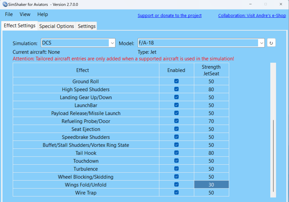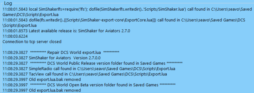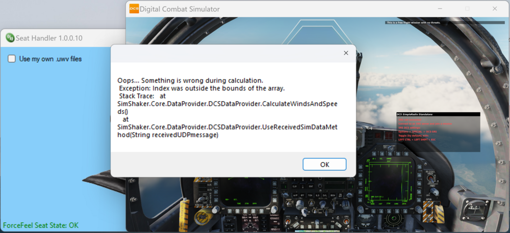 Were you able to resolve the issue? It sounds similar to my post on the SimShaker for Aviators DCS Channel: https://discord.com/channels/679923885595951128/910419903411015680/1261070667353428048 I have tried "Fix DCS Export' and done a DCS Repair. I found this related thread on the SimShaker for Aviators Discord Channel https://discord.com/channels/679923885595951128/921643357040672788/1078944348982497350 regarding SSA Port 29375 per SimShaker website FAQs https://simshaker-for-aviators.github.io/SimShaker-for-Aviators-Releases/faq.html I followed the instructions to install SSA for DCS. Output Mode: USB Forcefeel. Seat Handler 1.0.0.10 "ForceFeelState: OK." Test Vibe Motor Shaker: all motors works ... vibration si felt DCS F/A-18 recognized in DS Debug View. Logs show Export is being sent to DCS Scripts Export.lua . So the HF8 seat checks out but the DCS telemetry may not be received... I do not feel any vibrations in game DCS, and a SSA error message comes up. Ooops ... Something is wrong during calculation Exception: Index was outside the bounds of the array Stack.Trace: at SimShaker.Core.DataProvider.DCSDataProvider.CalculateWindsANDSpeed() at SimShaker.Core.DataProvider.DCSDataProvider.UseReceivedSimDataMethod(String receivedUDPMessage) What did I miss in configuration? Checking Port conflict https://discord.com/channels/679923885595951128/910419903411015680/1107021363186769980 mentioning Port 29375 may be assigned to DCS and SSA. Local IP 127.0.0.1 a netstat -ab UDP search: UDP DCS.exe on 7080, 63816 and 43001, (10308 for MP) SimShaker for Aviators,exe 29375 (DCS), 54930 (XPlane ?) and 62017. ibaJetSeatHandler,exe 29376 . No conflicting UDP Ports? -