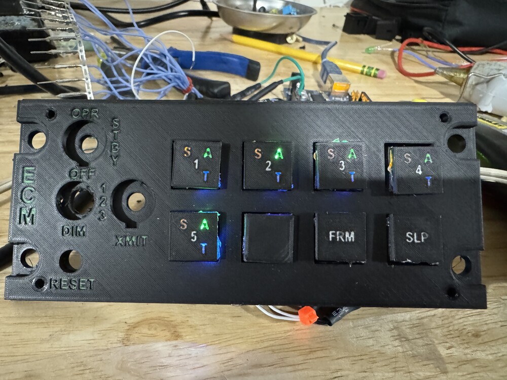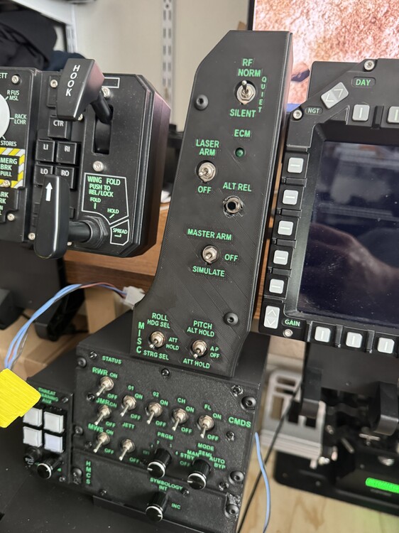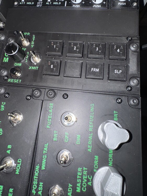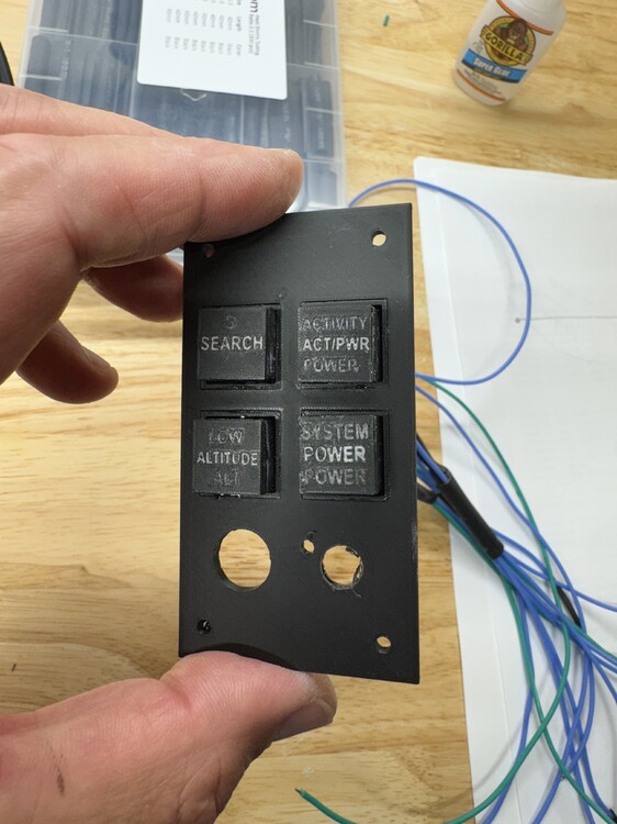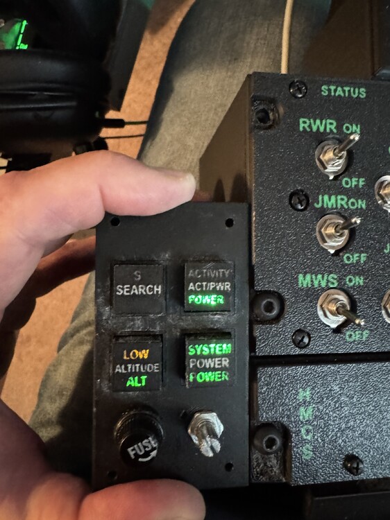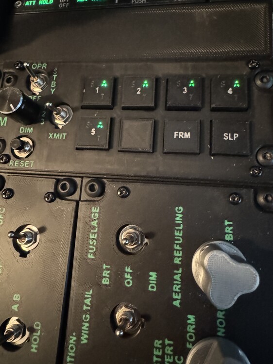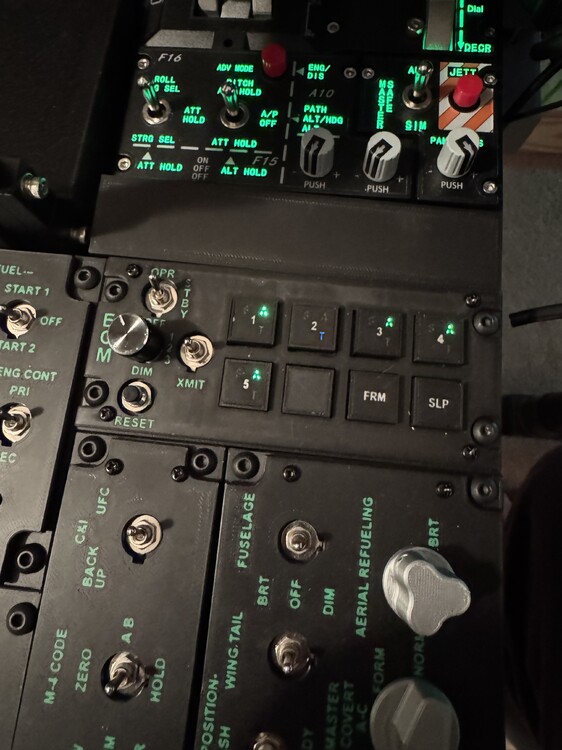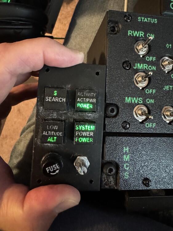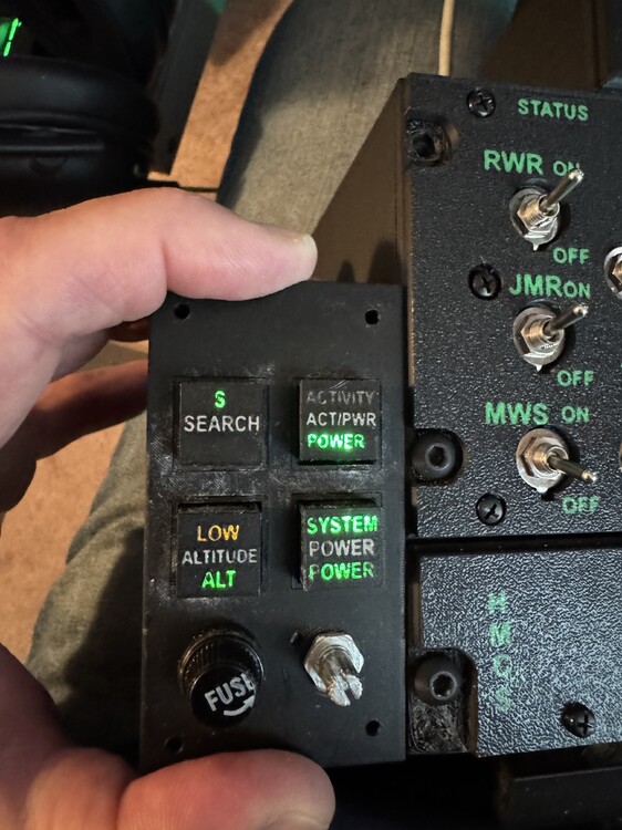 Two things.... 1. DCS via BORT can use momentary switches for these. I made a prototype with both Momentary Switches and Latching Switches, and went with the latching microswitches. 2. There is a bug in Port and/or DCSBIOS with regard to the "Search" Button and the "Altitude Button." If you mouse click these buttons they simply turn Search on and off as expected, and Altitude from Low to not low, however, if you use an external physical toggle button or the momentary button type using the Bort command that emulates a Toggle, or even push the "Toggle" button within BORT, those switches act incorrectly. When you hit your physical button the Button IN GAME moves but the light does not go off until you cycle this twice. I noted this when I used the original lighted button toggle switches (just flat top with white LED). Hopefully this bug can get fixed at some point. My 'design' was adopted from Joes Homecockpit design, but I made the inner button longer, moved the side pins down, and redid the base to allow the use of the different switch. Glueing the LED's in place is a must since the LED's move with the inner switch box and this moves the wires and makes the switches bind. I added the hot glue and bingo the switches worked better. My newer design is better and will use smaller gauge wire to eliminate binding. So I popped the Buttons off and hot glued the LED's, and can salvage this design. I'll use the better design for the ECM buttons. Top panel is still in my printer, the openings for the buttons was too tight, so had to reprint. Final photo to follow. Mike