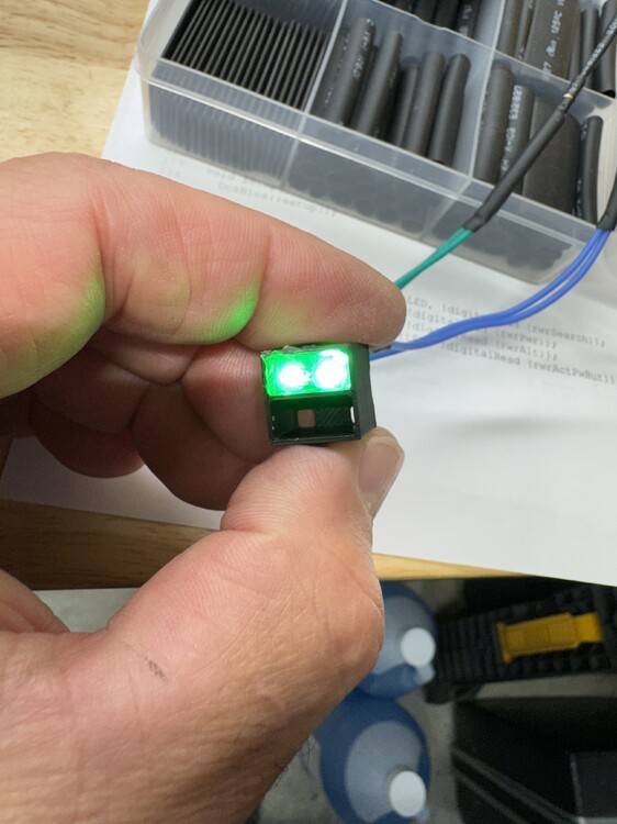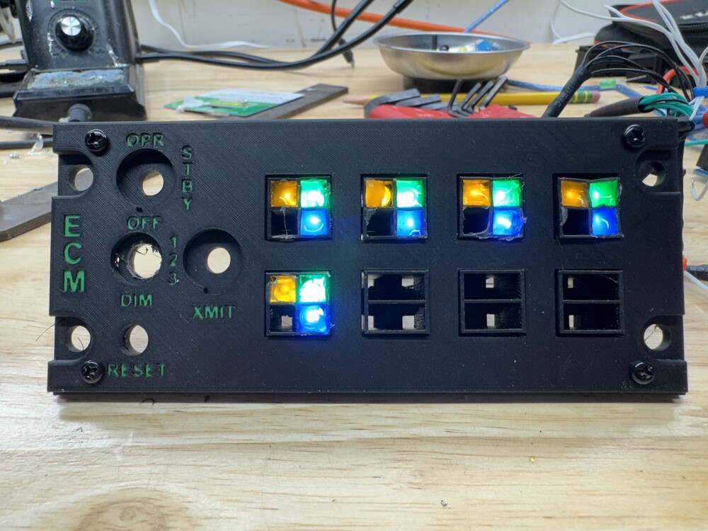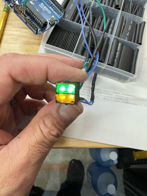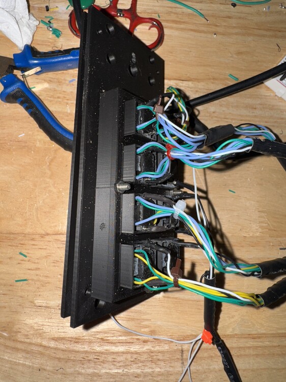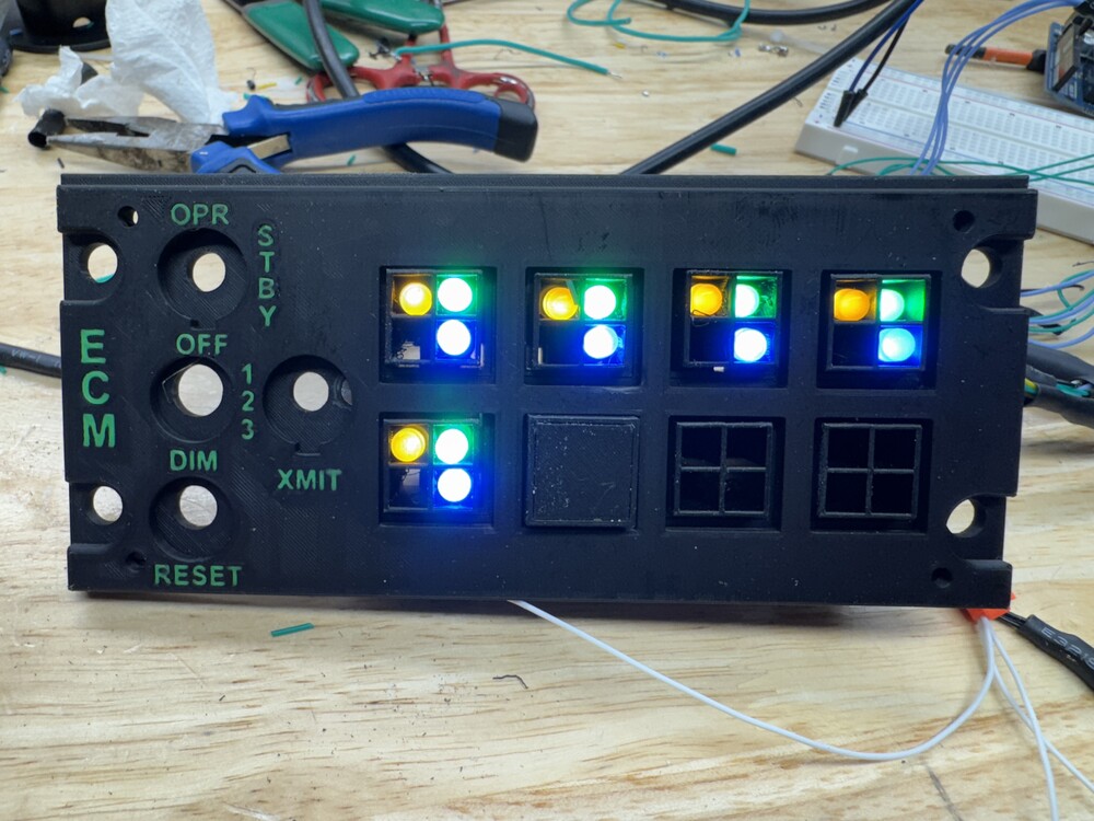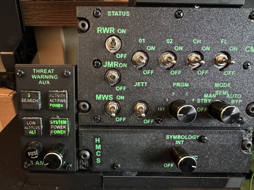 Two things.... 1. DCS via BORT can use momentary switches for these. I made a prototype with both Momentary Switches and Latching Switches, and went with the latching microswitches. 2. There is a bug in Port and/or DCSBIOS with regard to the "Search" Button and the "Altitude Button." If you mouse click these buttons they simply turn Search on and off as expected, and Altitude from Low to not low, however, if you use an external physical toggle button or the momentary button type using the Bort command that emulates a Toggle, or even push the "Toggle" button within BORT, those switches act incorrectly. When you hit your physical button the Button IN GAME moves but the light does not go off until you cycle this twice. I noted this when I used the original lighted button toggle switches (just flat top with white LED). Hopefully this bug can get fixed at some point. My 'design' was adopted from Joes Homecockpit design, but I made the inner button longer, moved the side pins down, and redid the base to allow the use of the different switch. Glueing the LED's in place is a must since the LED's move with the inner switch box and this moves the wires and makes the switches bind. I added the hot glue and bingo the switches worked better. My newer design is better and will use smaller gauge wire to eliminate binding. So I popped the Buttons off and hot glued the LED's, and can salvage this design. I'll use the better design for the ECM buttons. Top panel is still in my printer, the openings for the buttons was too tight, so had to reprint. Final photo to follow. Mike